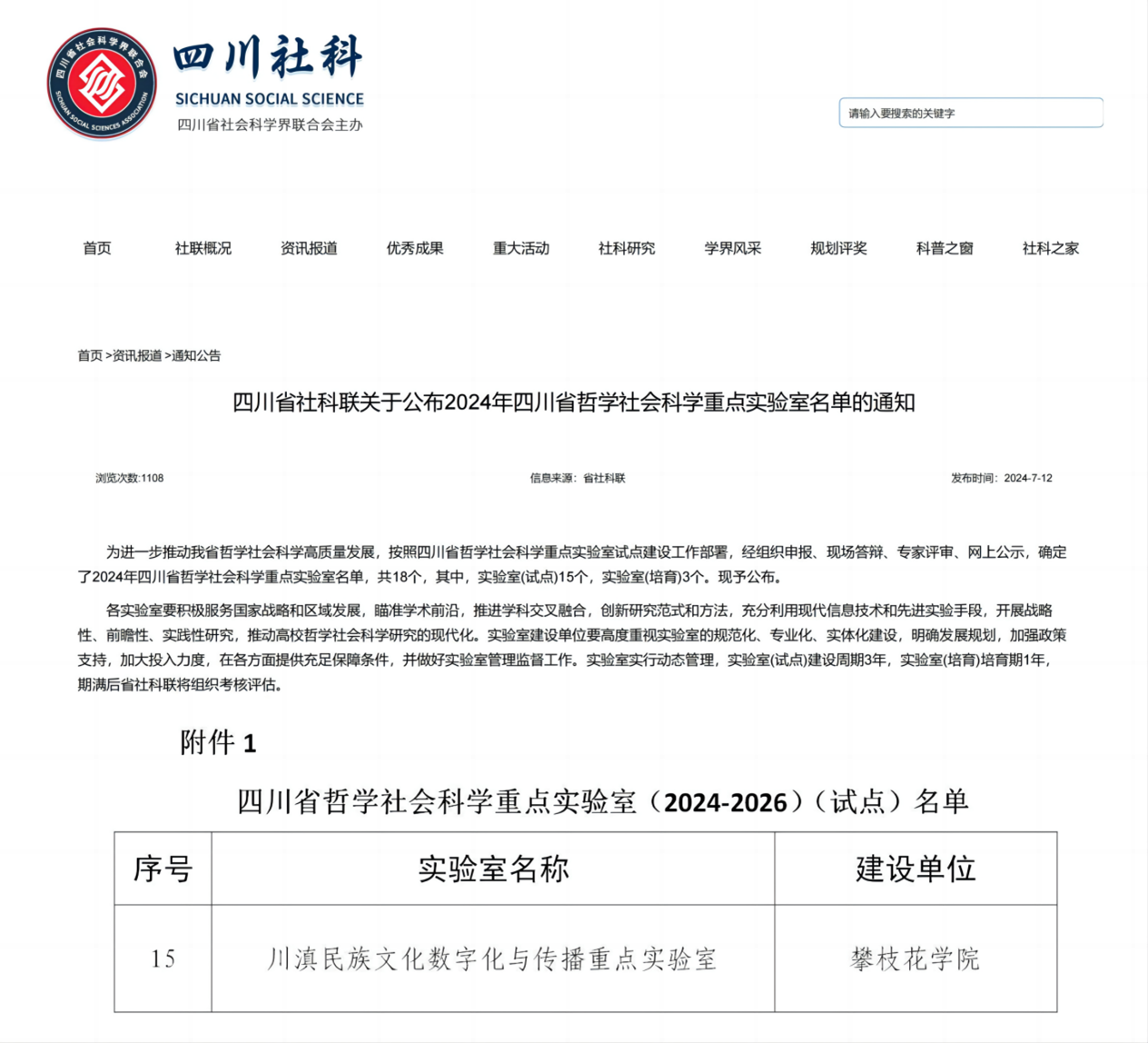 近日,四川省社科联正式公布了2024年四川省哲学社会科学重点实验室名单,全省共31个实验室参与申报,最终入选18个,其中,实验室(试点)15个,实验室(培育)3个。由三亿牵头申报的“川滇民族文化数字化与传播重点实验室”成功获批。