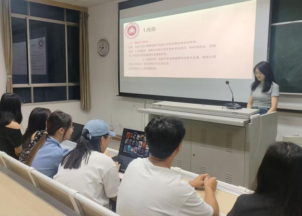 活动伊始,副部长方星一向大家介绍了宣传部的基本职责和工作流程,使干事对部门工作有了更加清晰的认识。部长黄玲珑分别就宣传策划、文案撰写、海报制作等方面进行讲解,同时结合个人实践经验为大家分享宣传工作中的成功案例和心得体会。实际演练环节,干事们分组进行了宣传策划和海报制作练习,大家充分发挥想象力,提出了新颖的宣传方案,并在相互讨论中得到优化。