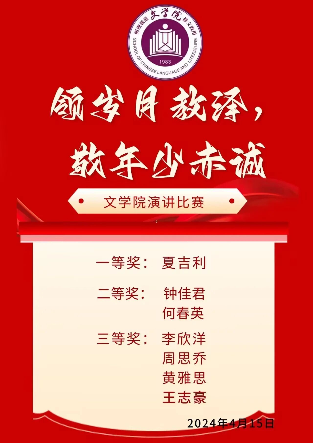 夏吉利获得一等奖,钟佳君、何春英获得二等奖,李欣洋、周思乔、黄雅思、王志豪获得三等奖。