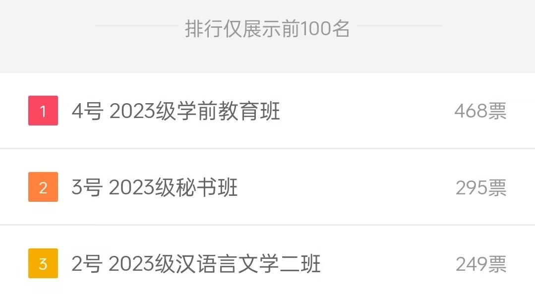 最终,体操比赛结果由线上和线下投票汇总得出,2023级汉语言2班荣获第一名,2023级秘书班荣获第二名,2023级学前教育荣获第三名,恭喜以上班级在体操比赛中获得优异成绩!
