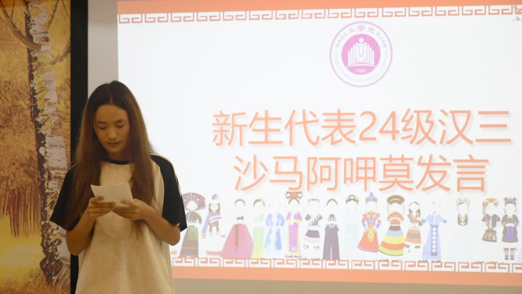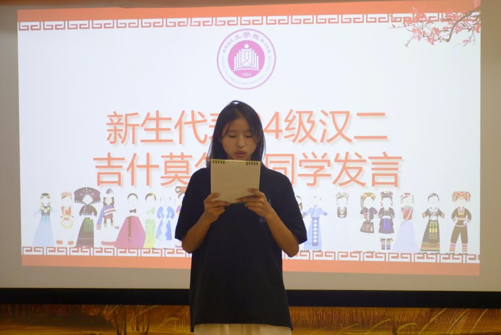 2024级少数民族员工代表吉什莫尔歪、沙马阿呷莫进行发言,表示部分少数民族员工在普通话交流、学习适应等方面存在一定困难,相信在大家的共同帮助下能够取得进步,同时呼吁同学们要弘扬民族团结精神,拒绝歧视与偏见。