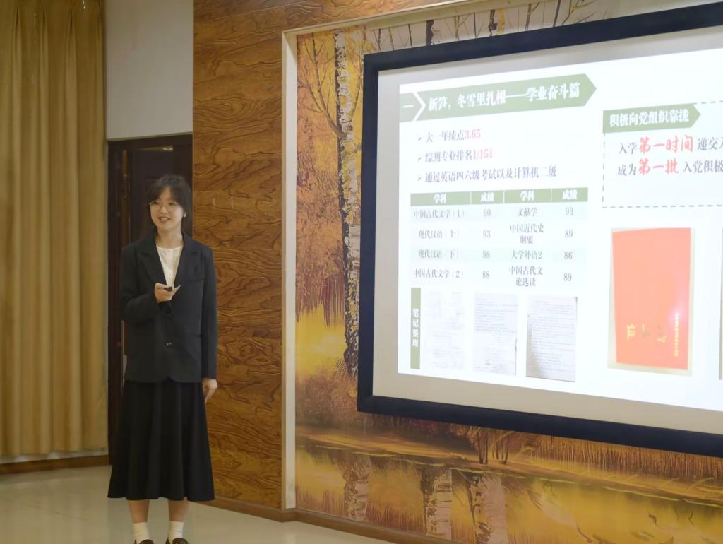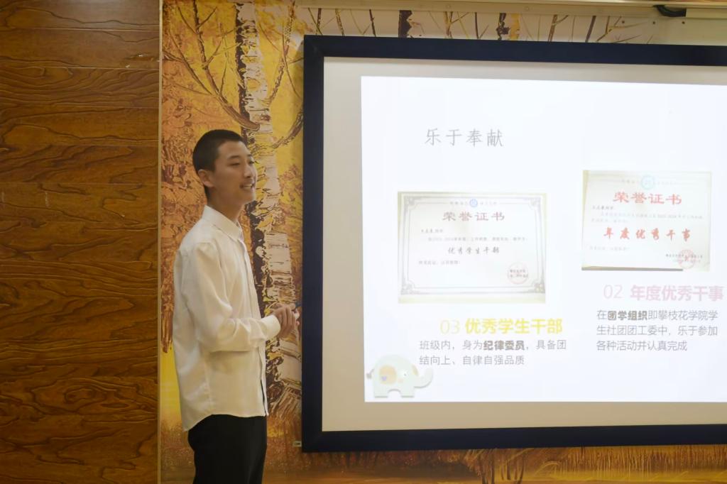 活动伊始,主持人简要介绍评选规则、活动流程和参与人员。每位参赛者按照抽签顺序依次上台竞选,分别从个人简历、思想、学习、综合实践、获奖荣誉等方面向评委老师和观众做详细展示,同时借助PPT、视频向大家讲述自身学习生涯和个人评选优势。