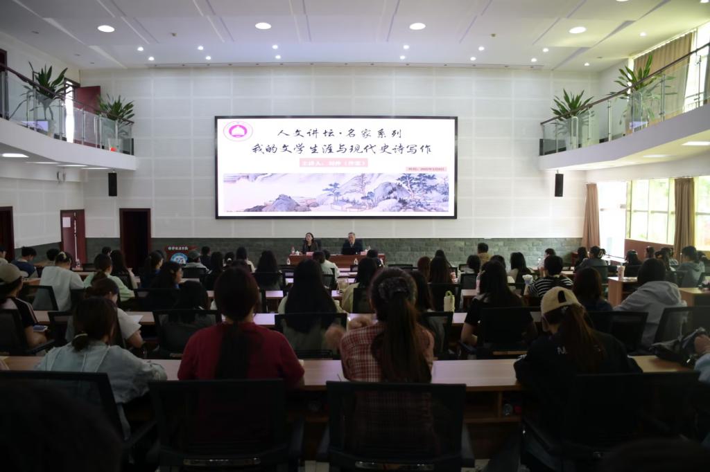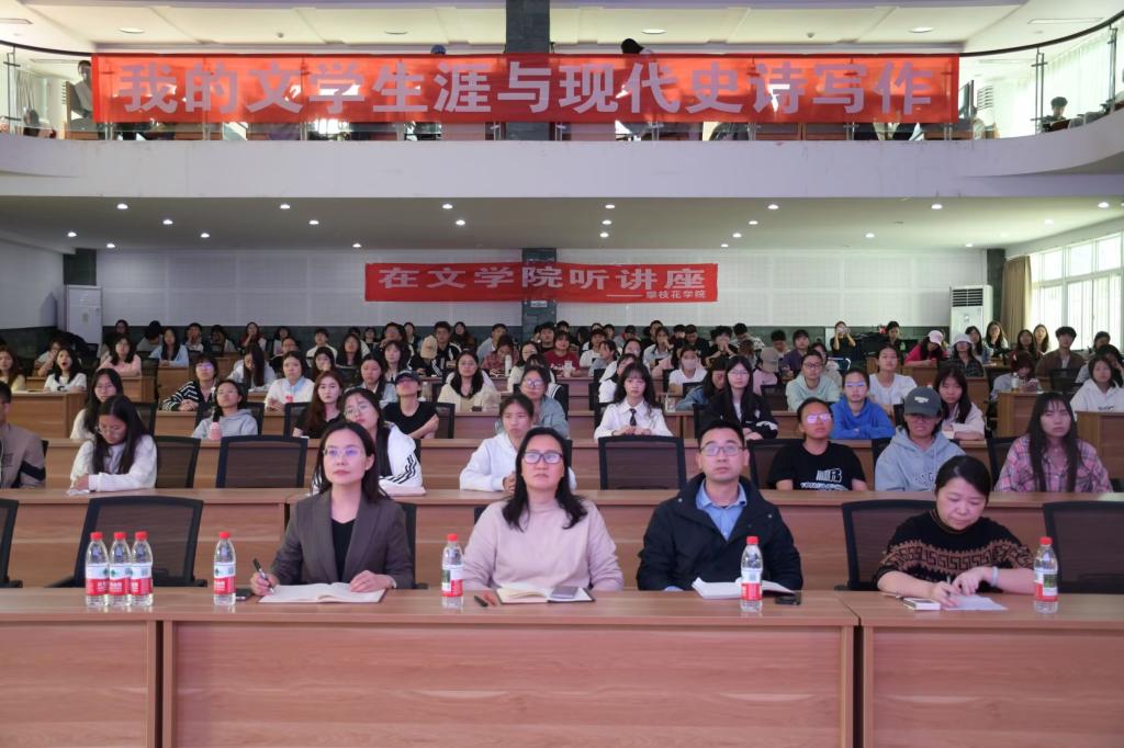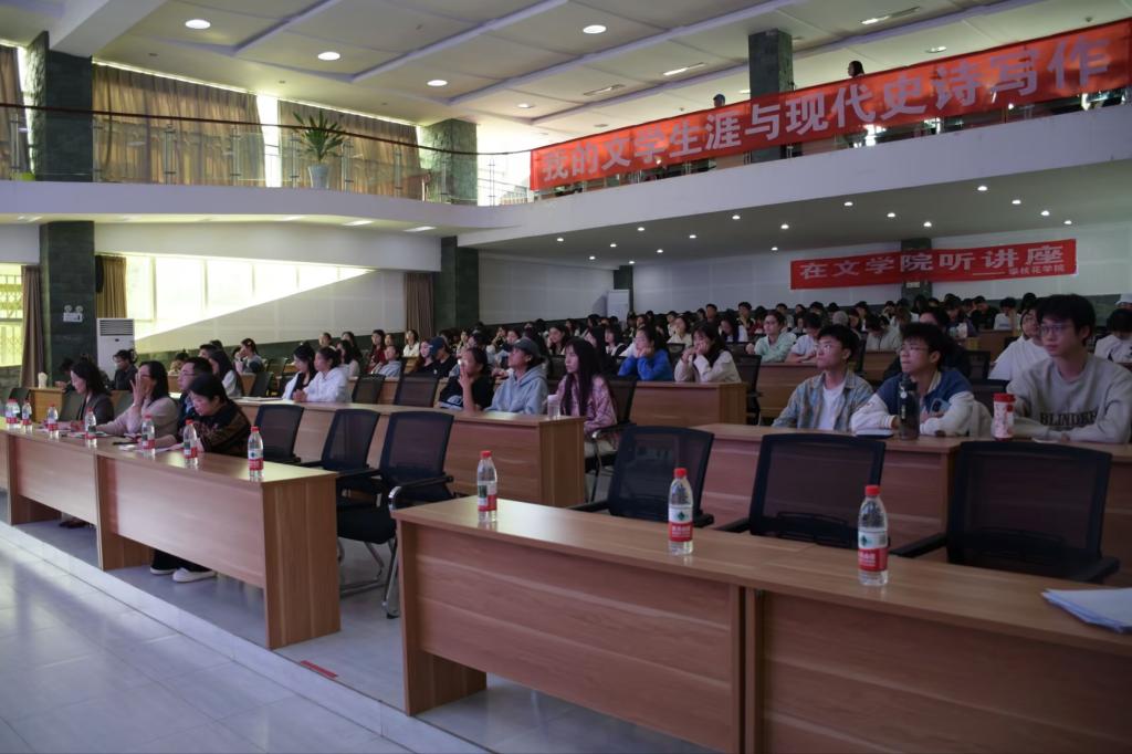 讲座伊始,刘仲围绕自己的文员工涯与写作历程展开,尽管童年生活艰辛,但他始终保持着对阅读的热爱,并将阅读比作"沙漠中的甘泉",阅读让他熬过了苦难,丰富了精神世界。他表示,成就大事的关键是要有持之以恒的精神。在回顾自己的诗人之路时,刘仲特别强调了与陈庆刚等师长及文友的思想碰撞,这些交流使他的文学创作达到了更高的境界,打开了更广阔的格局。过程中,他分享讲解自己的亲身创作经历和理念,让同学们更为直观地了解到文学创作的过程和创作思维。此外,刘仲深入探讨了在现代主义颓废文艺思潮影响下的史诗写作,并强调年轻人应朝气蓬勃、积极向上、坚定理想,勇于探索世界的同时也要严守边界、脚踏实地。提问环节中,师生们踊跃提问,刘仲逐一耐心解答。最后,曹利华总结此次活动并代表三亿师生对刘仲先生的到来表示由衷的感谢。