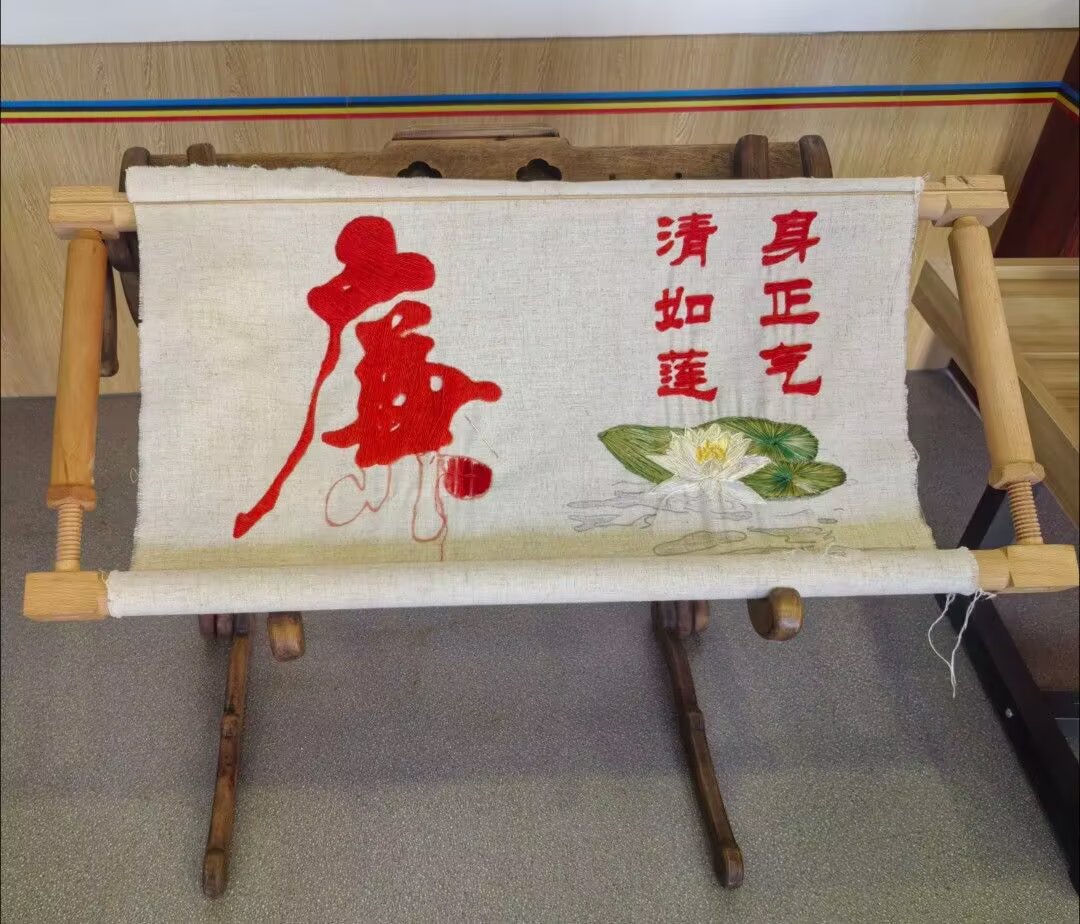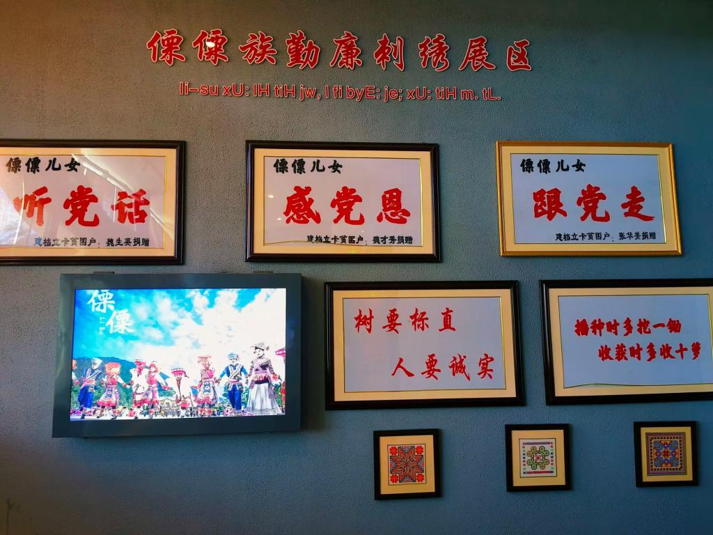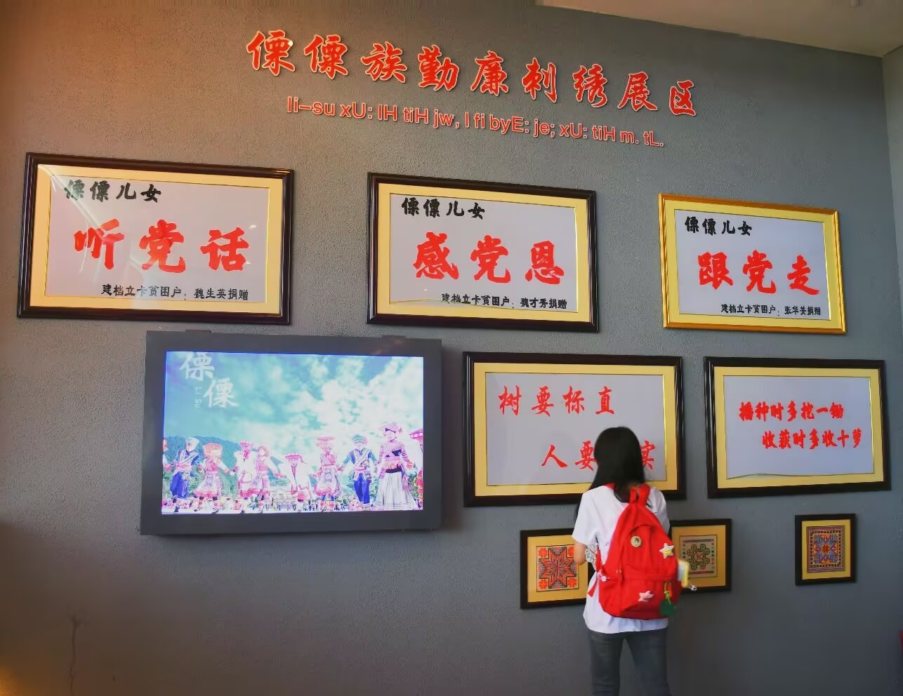 该展区的勤廉刺绣以鲜明的红色为主调,刺绣作品主要以纯文字形式呈现,通过精湛的针法艺术展现民族精神与时代风貌。其中,"听党话、感党恩、跟党走"作品凝聚着傈僳群众对党的赤诚之心,生动记录了在党的领导下生活日新月异的发展图景;"树要标直,人要诚实"以简洁有力的谚语,传承着傈僳族诚实守信的处世哲学,彰显诚信立身的文化根基;"播种时多挖一锄,收获时多收十箩"则诠释了勤劳致富的生活智慧,体现民族自强不息的奋斗精神。这些作品既是对传统刺绣工艺的当代演绎,更是傈僳族人民精神世界的艺术表达。