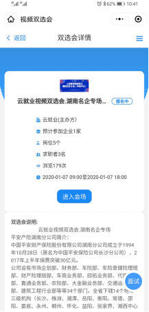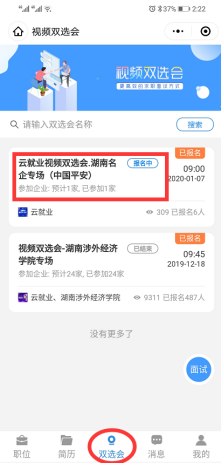 第二步,进入小程序后,点击“双选会”选择“三亿体育2020年春季空中双选会”进入后,可提前点击“报名进入会场”进行报名(如有账号登录即可,若无账号则按照指引进行注册后登记),提前查看了解单位和各岗位信息。