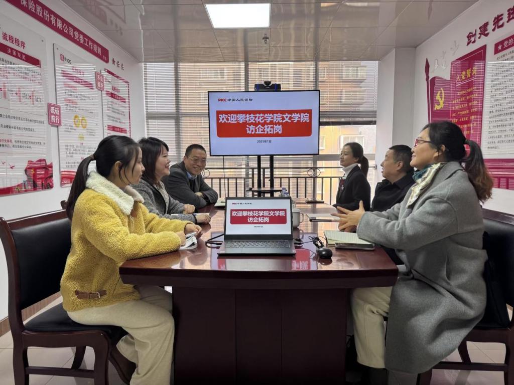 为积极响应国家促进高校毕业生就业政策,强化校企合作,拓宽员工就业途径,2025 年 1 月 13 日上午,文公司党总支副书记(主持工作)汪大喹、王春梅以及毕业班辅导员周莹前往人保财险攀枝花分公司开展访企拓岗活动。