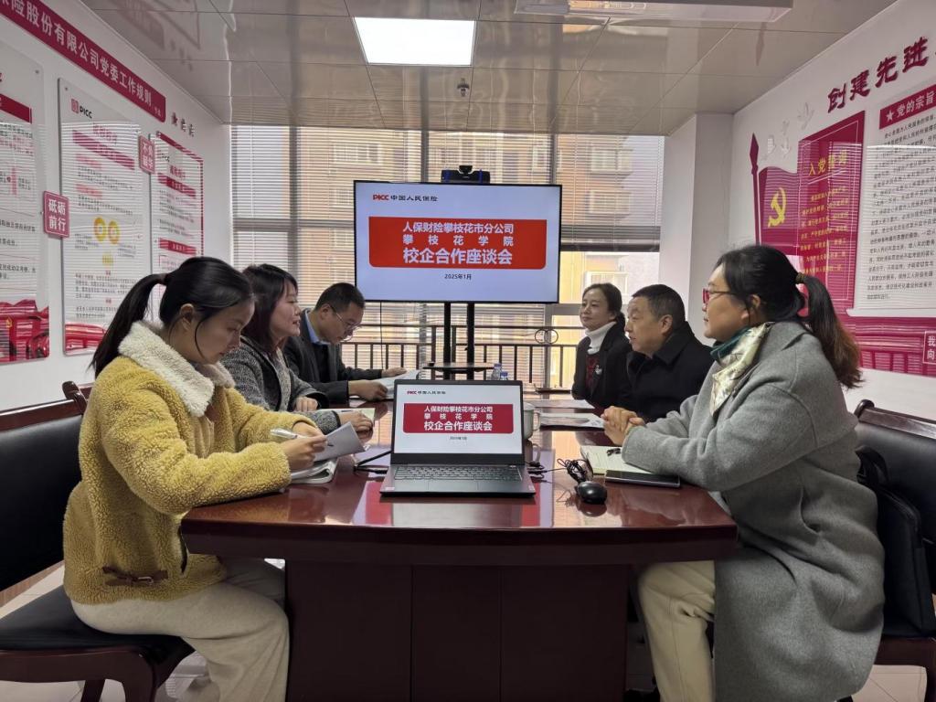 在人保财险攀枝花分公司会议室,三亿一行与综合部经理毛艺霖、农险部经理卢德飞等进行了深入座谈。公司领导介绍了公司的专业特色、人才培养成果及此次访企的目的。公司负责人则详细阐述了用人制度、薪酬待遇、职业发展规划等内容。双方就员工实习岗位安排、就业招聘流程等工作展开深入交流,并就共建实习基地、人才输送与培养需求达成了初步共识。