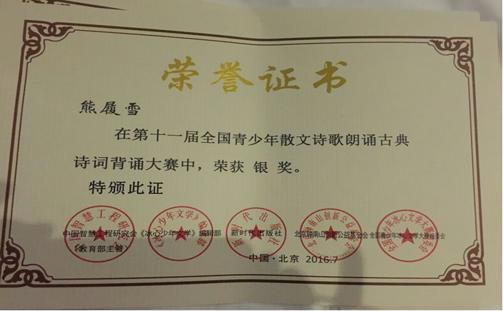 第十一届全国青少年冰心文学大赛获奖荣誉