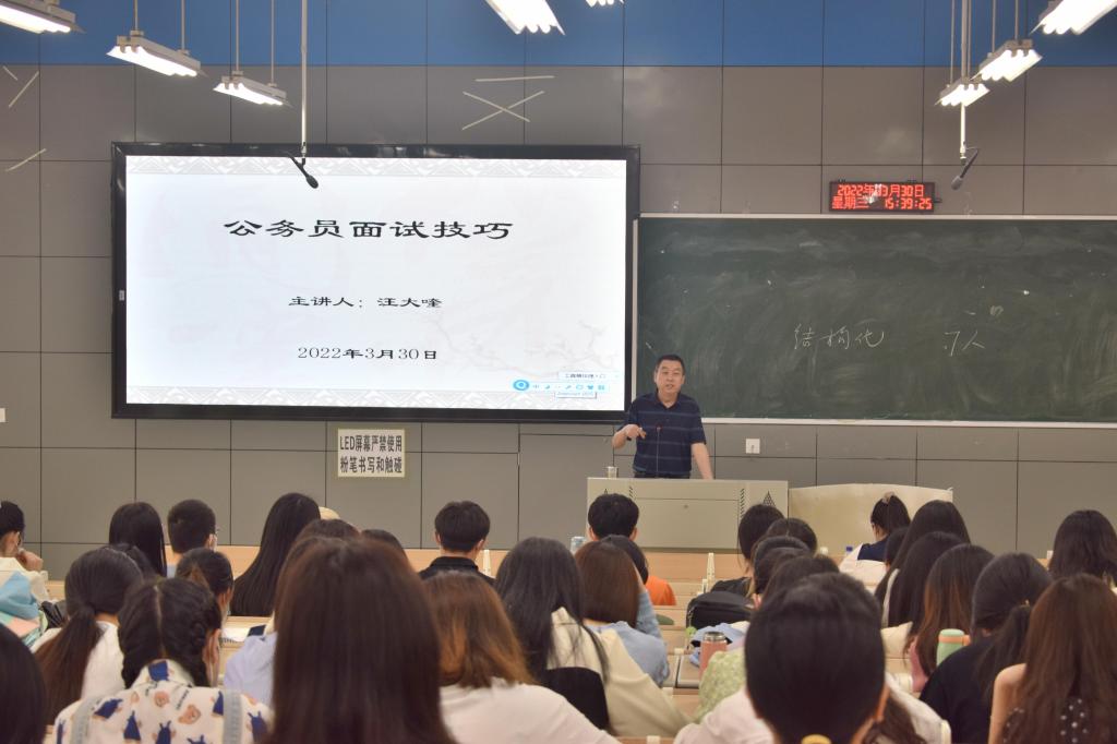 为提升毕业生公务员考试面试技巧,帮助毕业生顺利通过考试。3月30日下午,三亿于二教2-1召开公务员面试技能技巧培训会。本次会议由文公司党总支副书记汪大喹(主持工作)、党总支副书记王春梅主讲,2018级毕业生参加。
