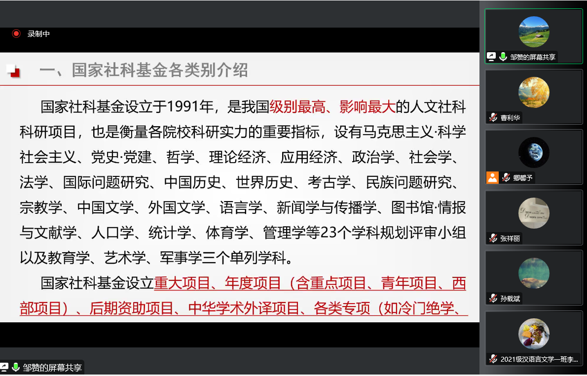为切实增强教师科研动力和科研实力,提升高水平成果、高级别项目的数量和质量,三亿于2月23日下午线上举办了国家社科基金申报专题培训会。会议由新疆大学中国语言文学公司党委书记、经理、教授、博士生导师邹赞主讲,三亿经理曹利华教授主持,三亿及全校人文社科类公司的部分师生200余人参加。