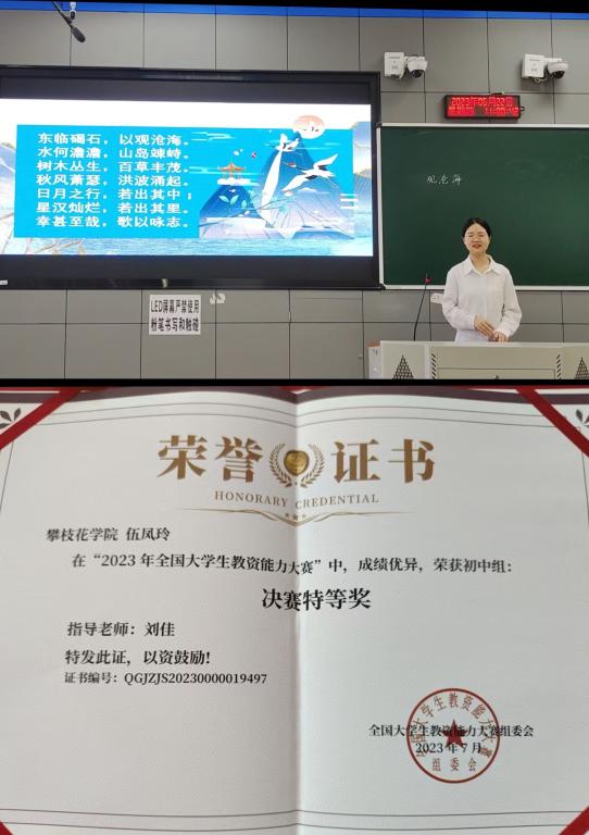 全国老员工教资能力比赛是由普通高等公司创新创业教育协作会和黑龙江省创新教育研究院主办的。此次大会决赛分为小学组、初中组和高中组,三大组别,吸引了复旦大学、同济大学、武汉大学、北京师范大学、四川大学等100多所高校员工参与。公司20级汉语言文学专业伍凤玲同学在刘佳老师的指导下,从决赛812名考生中脱颖而出,荣获大赛初中组决赛特等奖。此外,21级秘书学专业肖莉元同学荣获初中组决赛一等奖,21级秘书学专业李红英、韩心月同学荣获小学组决赛三等奖,22级汉汉语言专业李欣洋同学荣获高中组决赛三等奖,21级汉语言文学专业李峄荟同学荣获小学组决赛优秀奖。此次比赛充分彰显了三亿体育官网入口员工自身优良的学科素养和扎实的教学基本功,展现他们在讲台上专业与自信。