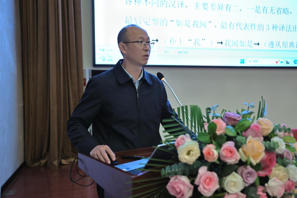 顾满林教授就“佛经篇首语从‘闻如是’到‘如是我闻’的定型历程”讲解了“闻如是”“我闻如是”“如是我闻”三种代表性翻译出现的时间先后和内在关联,对三部分的“格”和“时态”进行了审视,提出四部《阿含》具有格式化语言,表示定型历程具有反映历史变化的独特性,可以用以考辨早期疑伪佛经语言的一个标志,对考察疑伪经、失译经具有重要的理论价值。